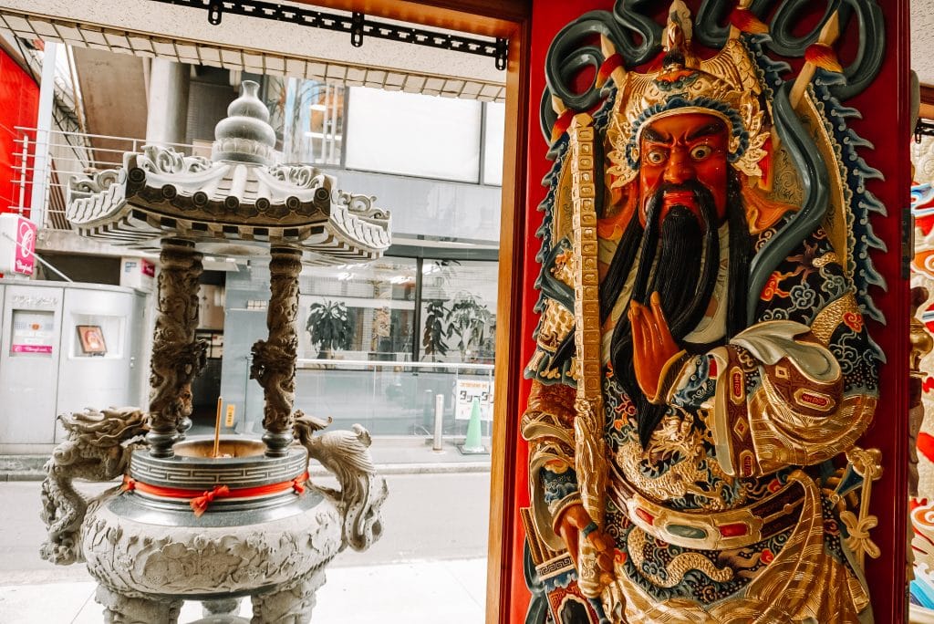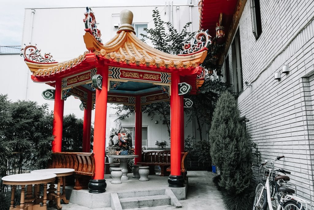 遠在日本東京,新宿區新大久保某條不起眼的巷弄內,其實也有一座 東京媽祖廟。 閩台廟宇的建築風格、鮮豔的色彩、門前冉冉昇煙的香爐,整座廟宇彷彿是從台灣飄洋過海來到這個大都市裡落地生根。夾在一片低調色系的日本店家中,這棟自成一格的建築奇觀任誰都會回頭多看它一眼。仔細觀察後會發現,它的本體結構其實還是標準的日本現代住宅,但在外觀及內容上看得出非常努力的營造出閩台廟宇的風格,甚至還有中式涼亭,誠意十足。