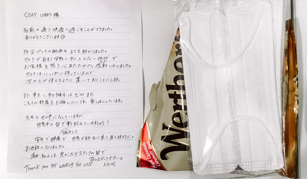 房務人員整理房間的時候,發現了這一封信。 原來是被公司派來東京出差,住在梯子公寓長達兩週的沖繩姊姊留給我們的。從4/8開始,東京進入緊急事態,我們也開始提供客人住福版的安心防疫包,除了有體溫計、口罩、消毒用漂白劑等物品,還有各種愛心補給品。 姐姐沒有辜負我們的心意,把所有補給品都吃完了。但離開時卻留下了一包奶油糖、一封親筆信和我們送她的兩副口罩。 因為真的很暖心 🥰,所以我們把她的信翻譯成中文跟大家分享 – Cozy Vibes 様 (梯子公寓的英文名) 如同公寓的名字一樣,在這裡度過了很舒適的時光,謝謝! 你們贈送的防災包真的非常很有幫助呢。 在口罩不易取得的的狀況下,你們為了客人設想、溫暖的心讓人感動。 因為我已經有很多口罩了,為了讓下一個人也可以使用,我把口罩留在這裡。 下次有機會再來東京的話,希望也能住這個房間。期待~。 在這麼辛苦的狀況下,世界上所有人一起齊心協力度過這個難關吧!祈願世界能夠回到原本健康、安全的狀態。 謝謝這段期間的照顧。 不嫌棄的話,請各位員工享用糖果。 Thank you for working for us ❤️ – 謝謝沖繩姐姐溫暖的鼓勵和善意的行動。她留下的口罩我們也會免費轉送給下一位買不到口罩的客人。如同她所說的一樣,我們也希望世界能夠早日回復原狀,大家一起加油吧! – 🔎 住福東京民宿臉書頁面https://www.facebook.com/sumifuku1690072/ Messenger私訊m.me/sumifuku1690072