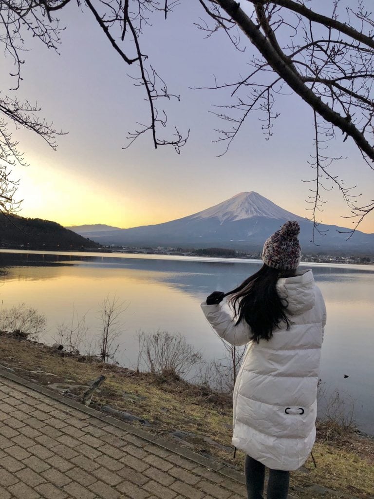 從我們住的小屋走到河口湖畔大約五分鐘的距離,但清晨的氣溫凍得我直發抖,短短的五分鐘如同五小時那般煎熬。到了湖畔才發現已經有不少人們也來等候2020年的第一道曙光。太陽悄悄地從我們的左邊升起,它是大自然的燈光師,伴隨著巧妙的移動,替富士山打出每分每秒不同的光線及韻味。我從未如此近距離看過富士山,有那麼一瞬間我屏住了呼吸,忘記了寒冷,像是終於見到了自己的偶像一般,這一刻一切都值得了!