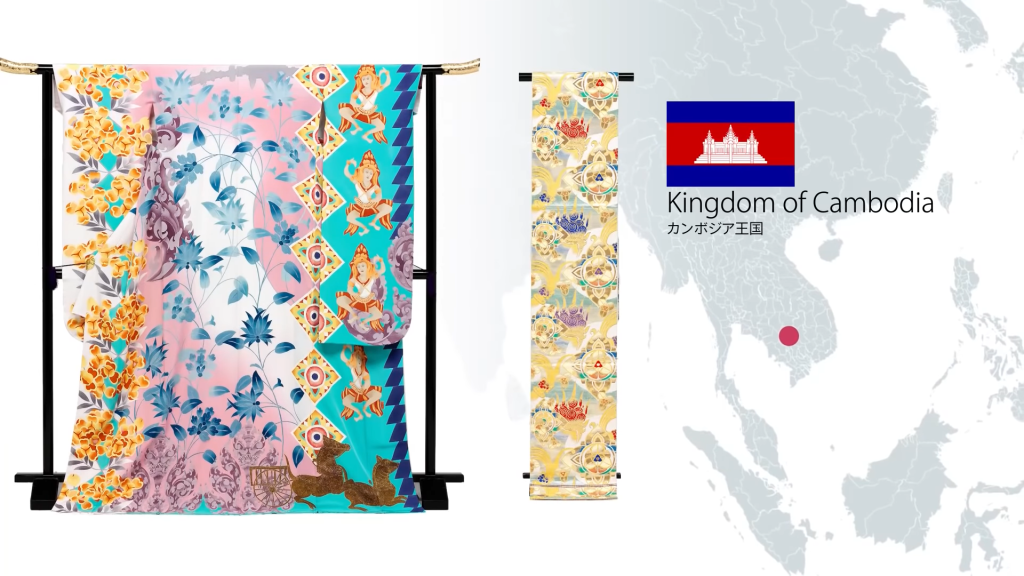 設計靈感是由柬埔寨的國花-隆都花來的,從水面反射出吳哥窟的神,是這款和服的特色。和服帶子的設計是從柬埔寨的自然風景來的,結合水、光及綠,把柬埔寨的特色表現的淋漓盡致。