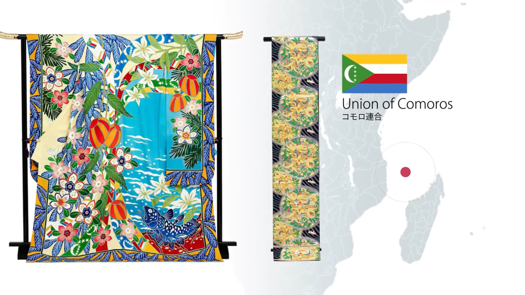 非洲阿拉伯國家島國,位於印度洋莫三比克海峽北部,葛摩在阿拉伯語的意思是月亮,衣服的下擺及袖子,都採用橘色,象徵太陽及大地,和服設計使用大量的花朵,顏色非常繽紛。和服的帶子是主要是依蘭花及月亮,整體來說,鮮豔中帶著溫和的感覺。
