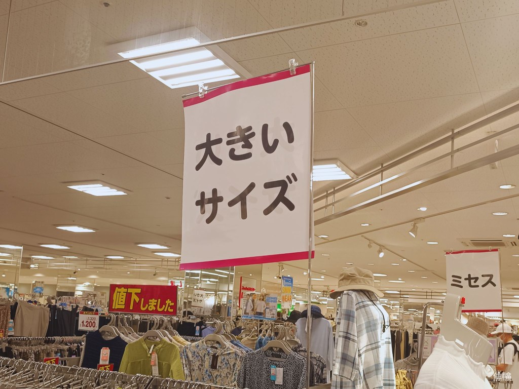Anyone who has spent time in Japan knows how challenging it can be to find clothing stores that carry their size. All stores in Shimamura Fashion Hub carry sizes from petite to what they call “Queen sizes” or up to 5L. Sizes above an L are usually found by the “大きいサイズ” (ookii saizu) signage.