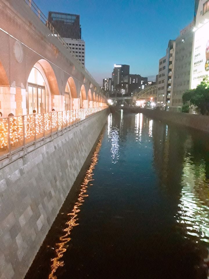 我心裡想該不會是什麼女僕酒吧吧😅 (秋葉原很難讓人不聯想到女僕呀),晚上走在熱鬧的秋葉原,街上的廣告看板、商街閃閃發亮,走著走著突然眼前出現河,很多人就這麼坐在河堤邊上聊天、工作,一整排的浪漫小燈泡裝飾,讓經過的人也都不經意停下腳步拍照。