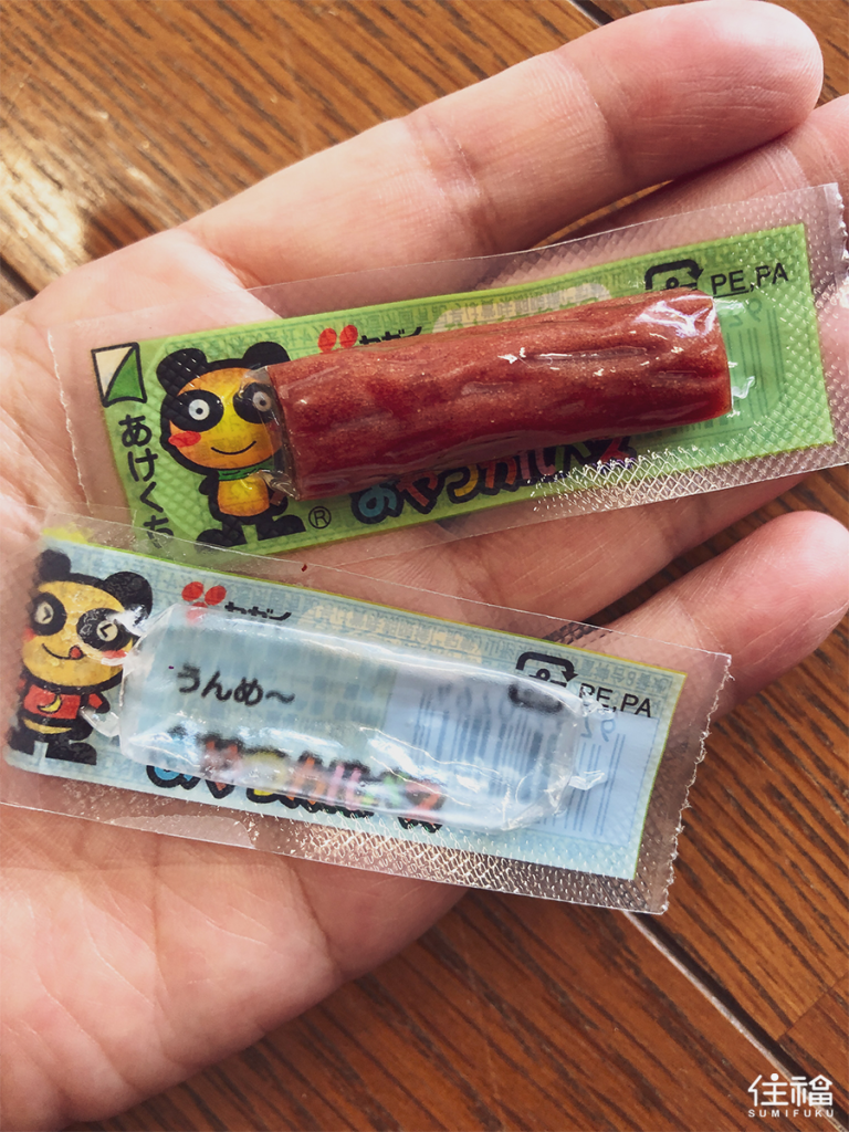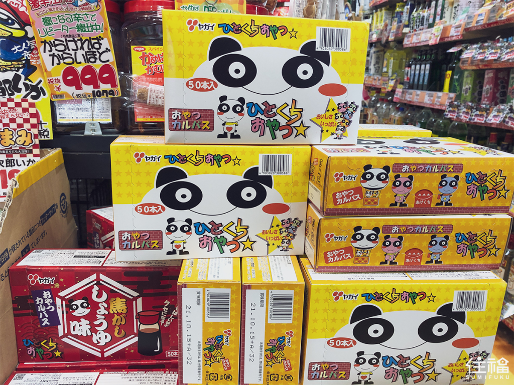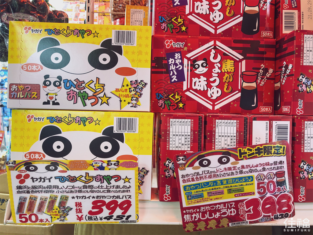 YAGAI牌的乾香腸(おやつカルパス)包裝蠻好認的,有一個很可愛、眼睛大大的熊貓圖案,你在超商或是超市都會看到,可以選擇單買也可以購買盒裝。