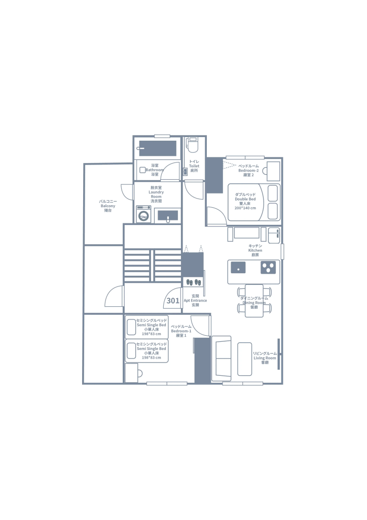 アパートメントには4つの異なるタイプの部屋をご用意しています:3LDK、2LDK、1LDK、そしてワンルームタイプ。ご家族連れ、カップルやご友人同士、またはお一人様のご旅行まで、どなたにも最適なお部屋をご用意しております。安心して、心に残る素敵な旅のひとときをお過ごしください。