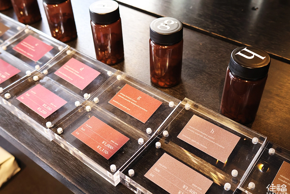 櫃檯前,有著整齊陳列的玻璃罐,擺放著各式產區的咖啡豆。顧客可逐一打開聞香,挑選自己喜歡的風味,草莓、桃子、肉桂⋯⋯每個咖啡轉開瓶蓋,散發出層次豐富的咖啡香,也體現了店家「以風味為起點」的精神。當你選定豆款後,可依個人喜好選擇冰飲或熱飲。無論是哪種溫度,奧井先生都會根據風味特性微調沖煮比例,緩慢且細緻地,展現出豆子原有的香氣與甜感。