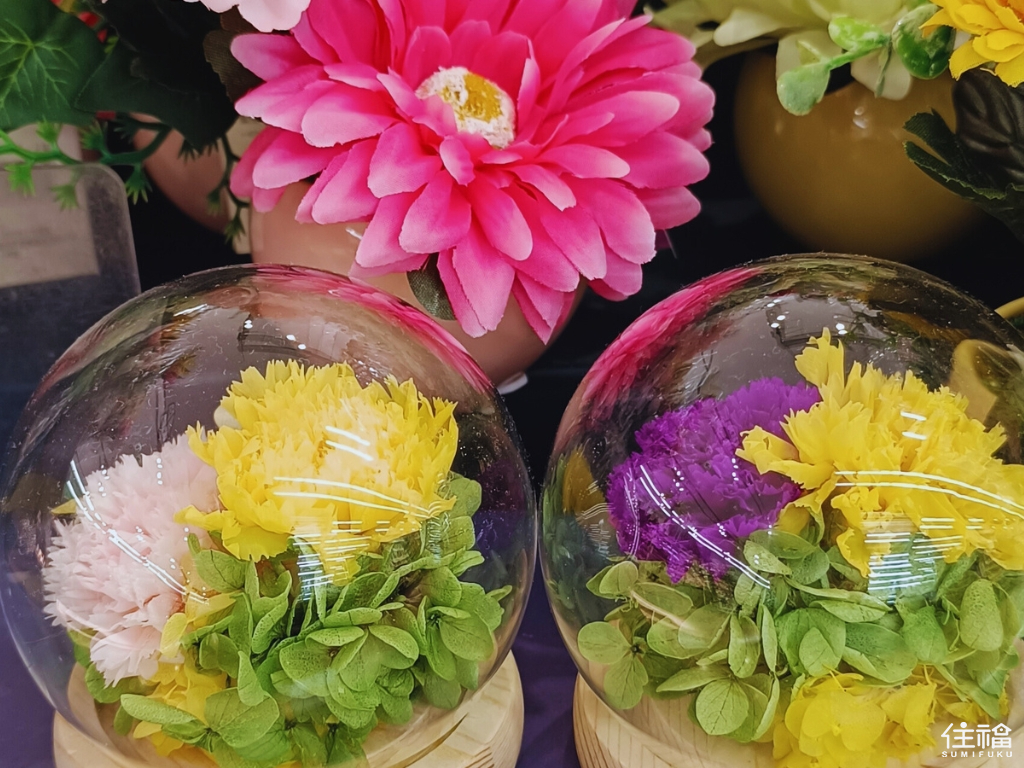 Flowers: Any flowers can be offered although it is common to choose flowers that the deceased loved. They are offered in odd numbers, such as 3, 5, or 7, and placed in pairs on the left and right sides of the altar. Red flowers like roses are reminiscent of blood so are usually avoided. Strongly scented flowers are also avoided and so artificial flowers like these below are sold in stores and supermarkets.