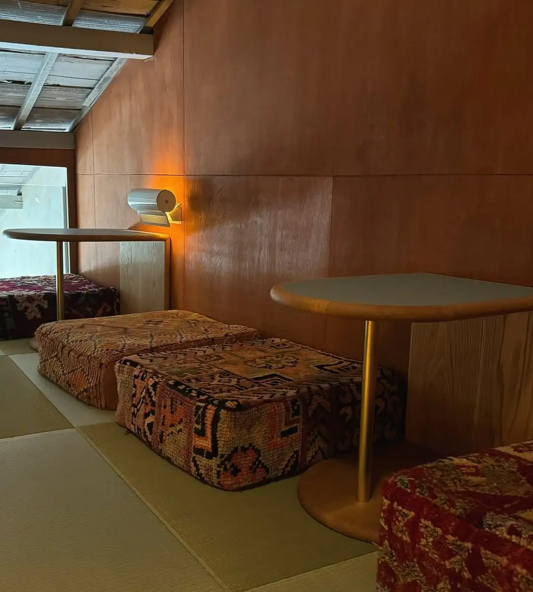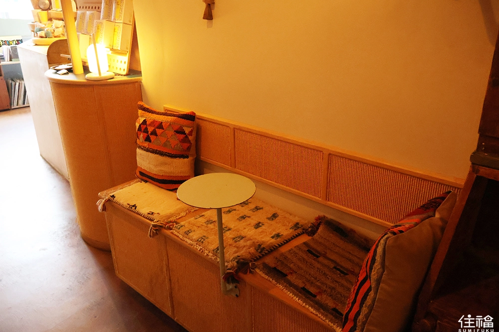 據說三樓空間以日式榻榻米打造,與一、二樓偏歐風的設計形成強烈對比。這樣的配置就像在整體空間中巧妙點綴的一筆,既突兀卻又恰到好處。而這一層原先保留了老屋原有樣貌,為了修繕與維護投入了相當多心力,由於這個夾層的高度較低,需要稍微放低身體以免碰撞,加上必須脫鞋入內,所以入內需要稍微留意這些小細節,一起來實際感受榻榻米所承載的日式精神!