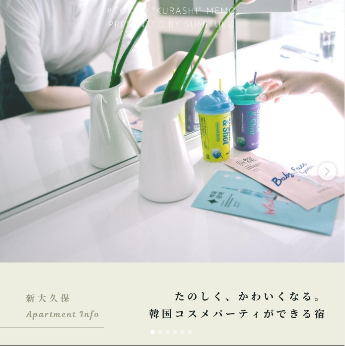 「Home’n Lounge」シリーズ、701号室のお部屋は、近くに韓国コスメのショップがたくさん。coumura本店などが近くにあり、美容への関心が高い人たちが集まります。日本ではなかなか手に入らないコスメもそろう新大久保。