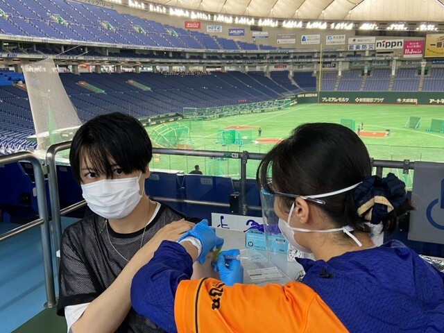 最後在施打完疫苗,還能從啦啦隊少女拿到紀念品,是不是也太幸福了!其實把接種會場設於東京巨蛋還有一層感人的用意,協辦人說歷年來在東京巨蛋舉辦各種大大小小的活動,能夠如此順利也要感謝在地的居民過去的支持跟配合,而這次作為接種會場使用,也是懷抱著報恩的心情。