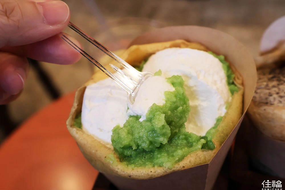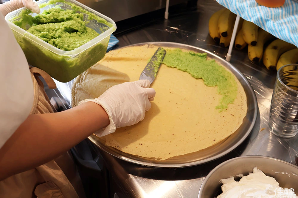 而說到口味,老實說我完全沒想到「毛豆」竟然能做成可麗餅。當她拿出那盒綠綠的食材時,我當下有點震驚,只是沒想到一吃口一後我就愛上毛豆口味了!若你這輩子沒有吃過毛豆口味,可以想像看看甜中帶鹹在口中慢慢展開,搭配帶有彈性餅皮一同入口,真的會一試成主顧。