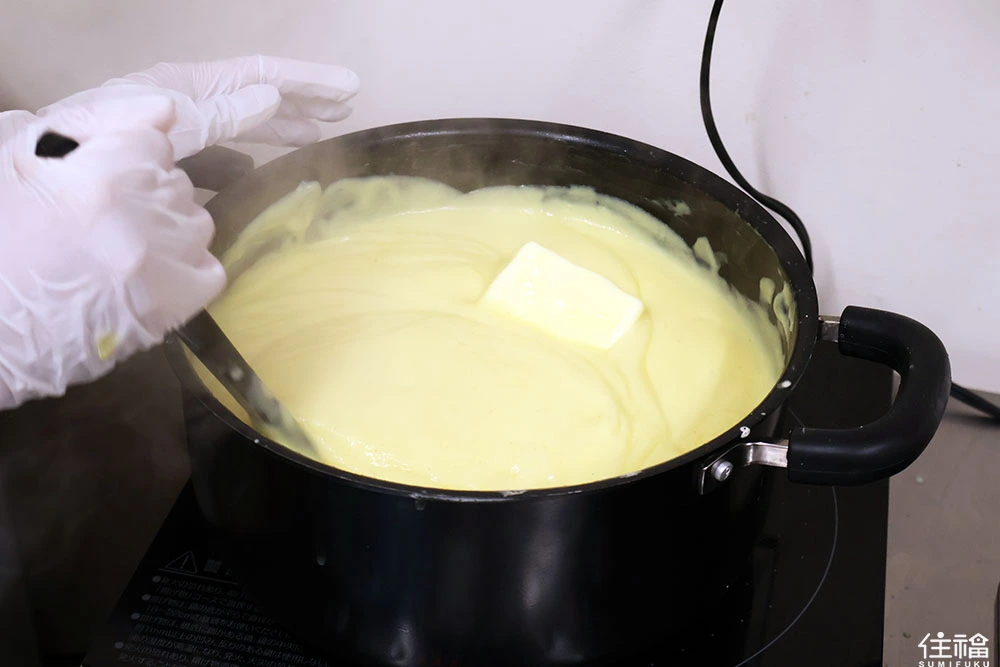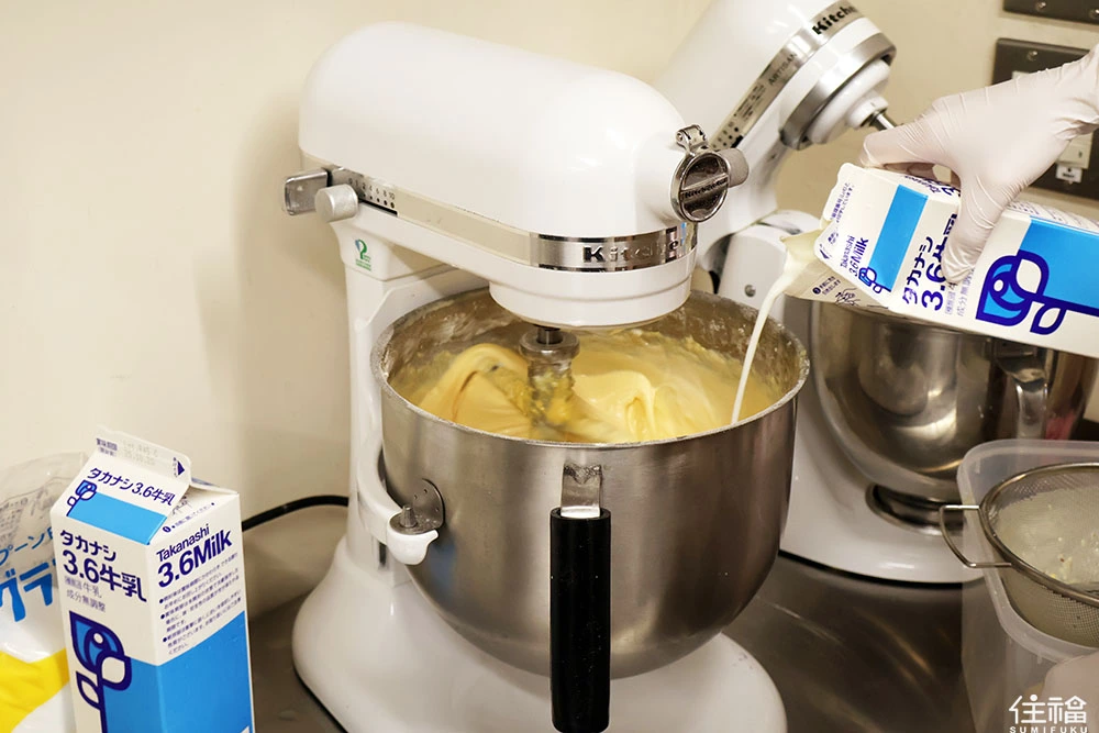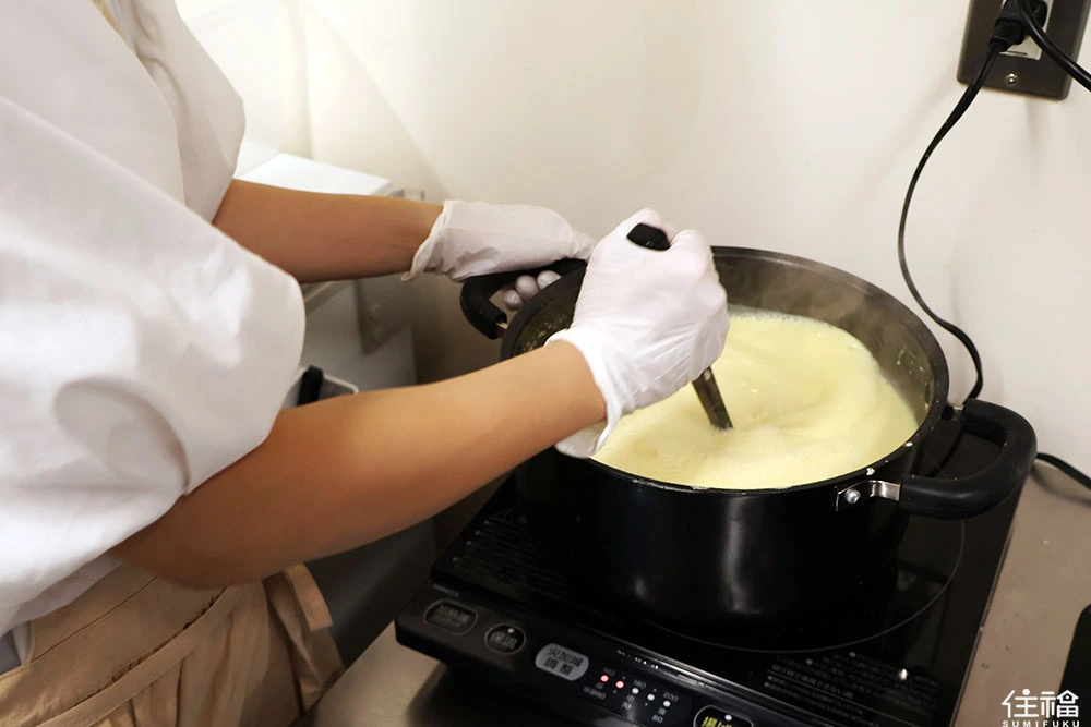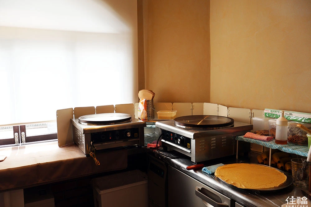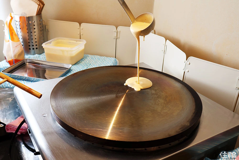 取材時創辦人非常熱情地邀請我走進廚房後台,親見可麗餅製作過程。原本還有些怕生的我,很快就被瀰漫的蛋奶香給吸引。看著麵糊依序加入新鮮牛奶、奶油,反覆加熱、攪拌,每個步驟都不馬虎,使人能感受到品牌對細節的用心。