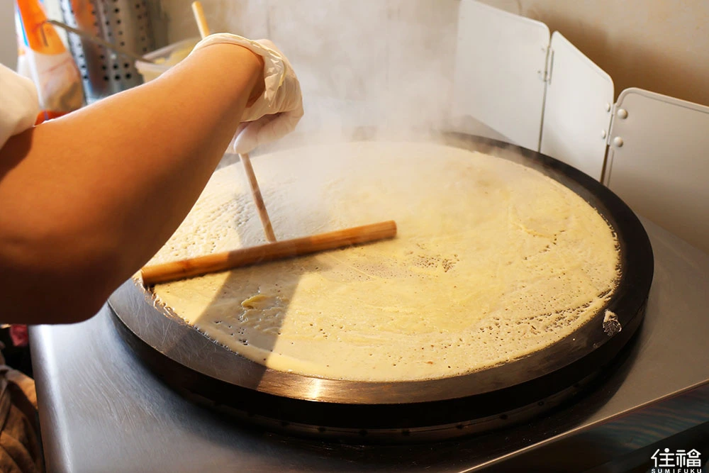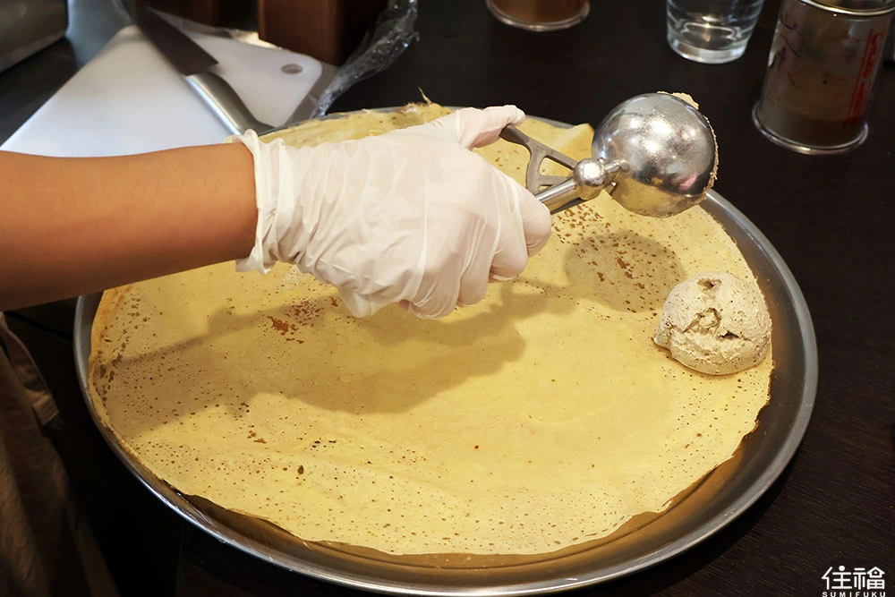 當我們完成麵糊並移動到可麗餅的熱爐前,麵糊瞬間倒下、極短時間內,需要迅速旋轉攤開,那毫不遲疑的動作,讓我心裡忍不住讚嘆:「不愧是一天能製作超過 500 份可麗餅的職人!」更讓人感動的是,遠藤創辦人還笑著問我細節要不要拍照,甚至主動幫我調整拍照角度,這份貼心與親切,真的很難不讓人喜歡上她,也讓人更想推薦大家親自來吃一次。
