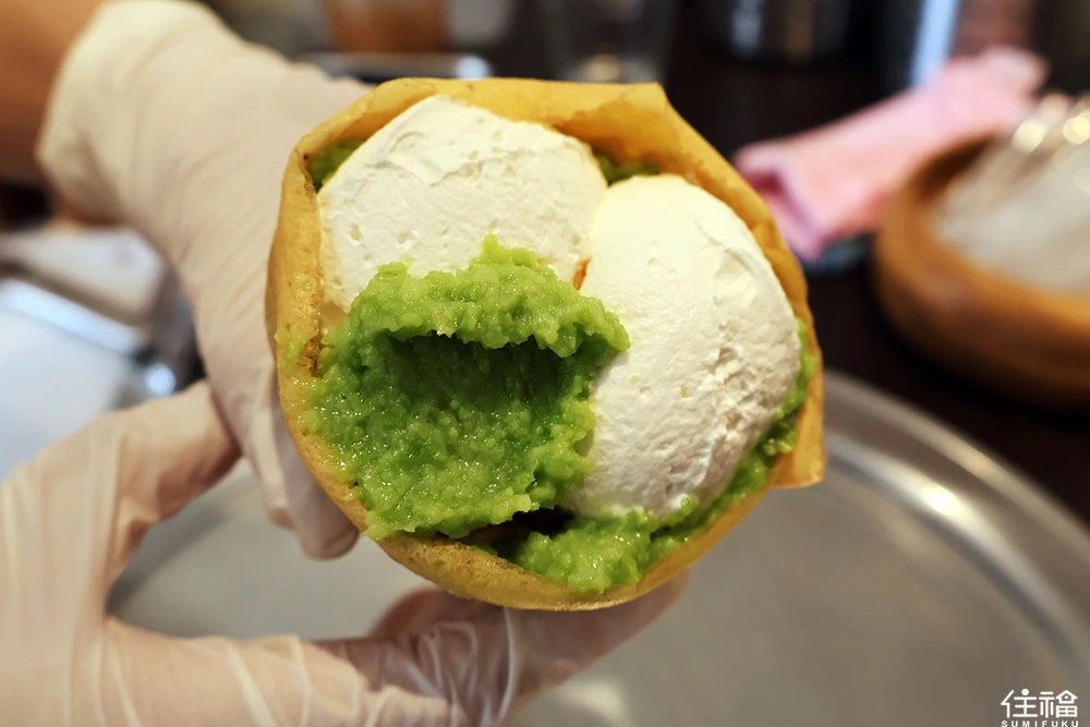 創辦人遠藤堅持使用家鄉宮城縣所產的高品質食材,將可麗餅視為承載土地風味的作品,不只是甜點本身。餅皮的靈魂來自宮城縣產的小麥「青葉之戀(あおばの恋)」,並與另一款小麥粉以獨門比例混合調配,經過反覆測試,才能在高溫鐵板上迅速加熱,呈現邊緣如紙般吃來薄脆、中心卻保有柔韌彈性的極致口感,入口時帶有令人難忘的 Q 彈層次,這樣的口感真的會讓人著迷,想一吃再吃!