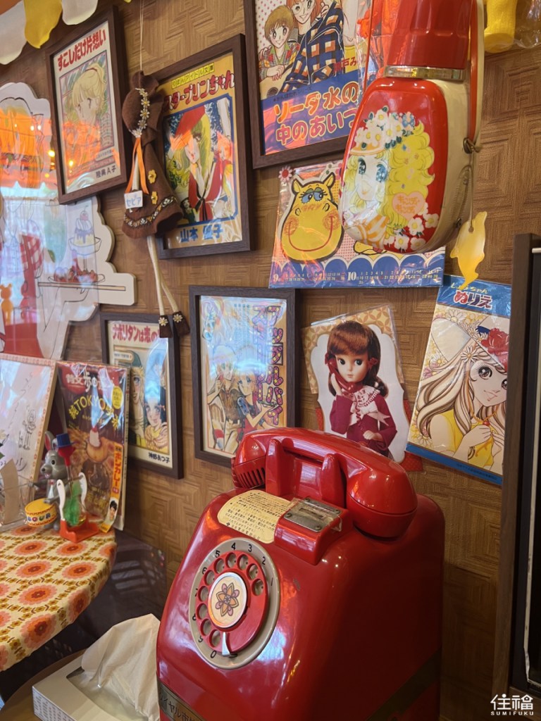 As soon as you step inside, you will feel like you have entered a Shōjo comic. Endless amounts of toys and vintage comic stripes cover the walls whilst the bright orange table covers and furniture help to further enhance the 60s vibe of the place. The place is truly nostalgic and has a comforting atmosphere as if it was a family home.