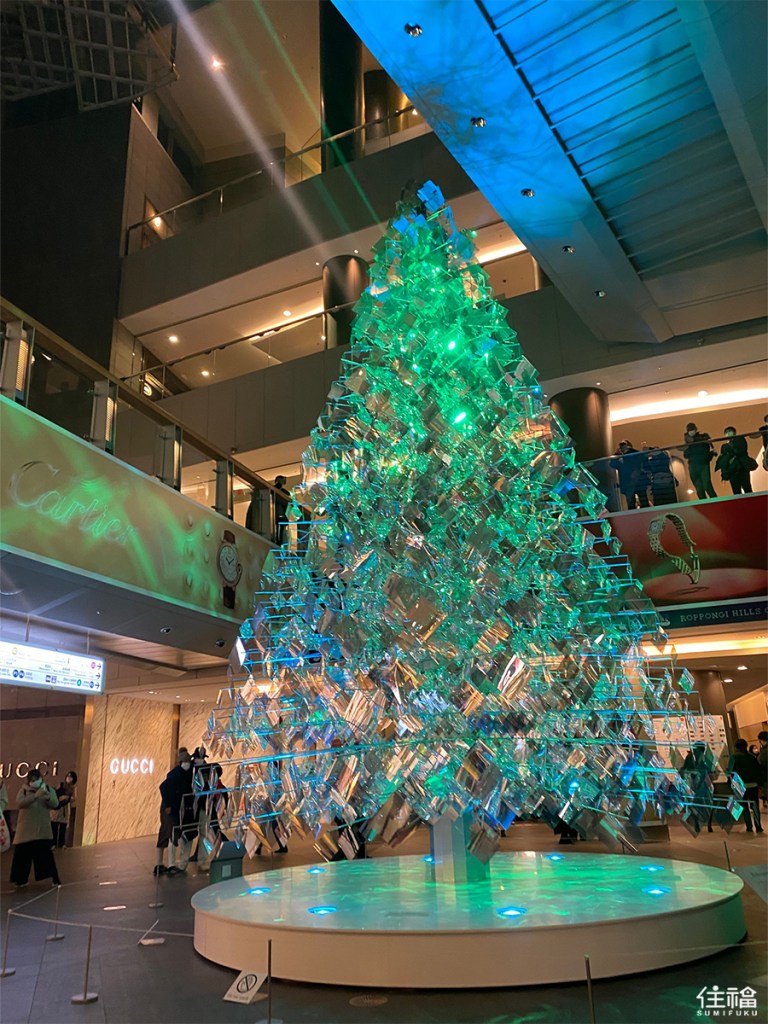 而位於「West Walk」靈感來自於閃爍火花的聖誕樹,利用光線的反射,映照七彩的光線,讓六本木之丘的冬天將被披上了夢幻繽紛的色彩,像鑽石般的閃耀,在有天井的空間當中白天和黑夜都能享受到這棵聖誕樹的魅力。