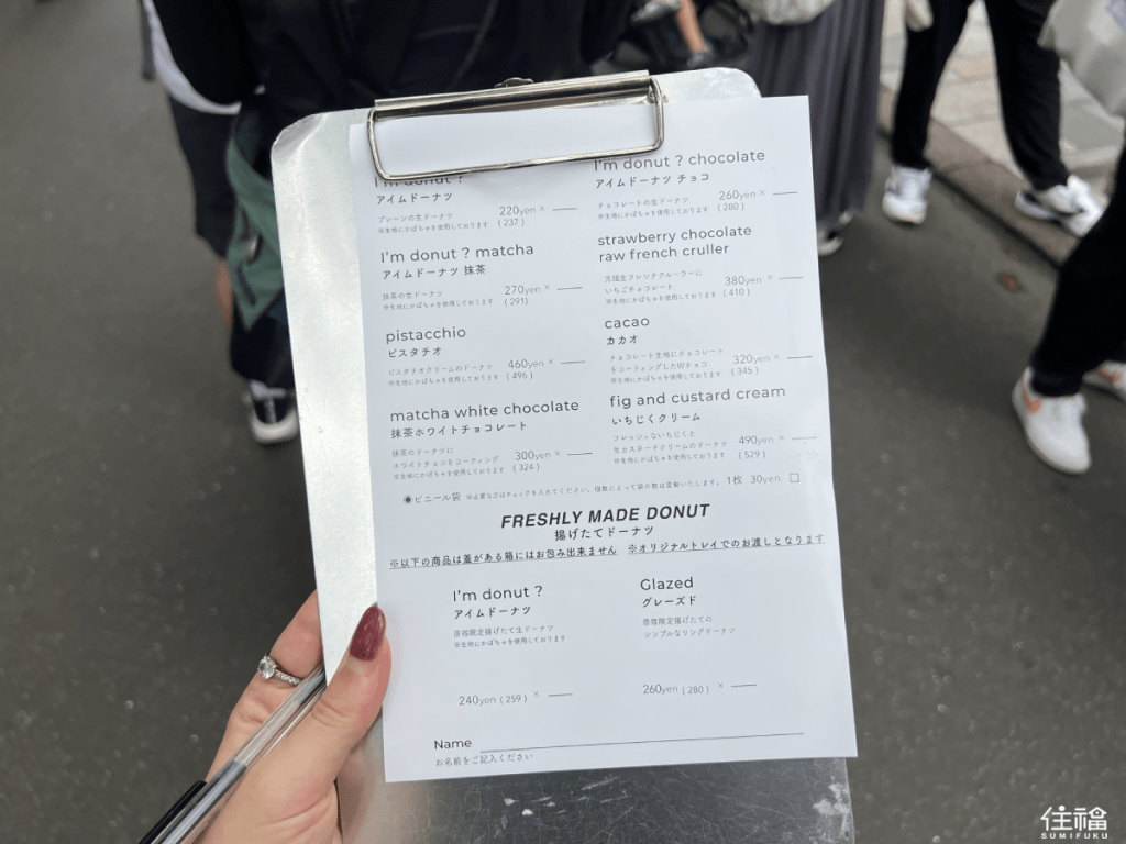 在排隊的過程中,會拿到店員遞來的紙本菜單,每一個甜甜圈口味雖然都是以日文介紹的,但名稱有標上英文,滿容易理解的。