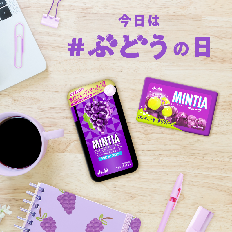 此外,日本在地非常推崇「產地銷售」,不只是喉糖,你也可以在野菜蔬果汁也會同步透過包裝推廣產地果物,而 MINTIA 時常會在特定的季節裡,推廣這些地域性的水果,像是山梨的綠葡萄、愛媛的柑橘⋯⋯透過這樣的限定口味推出,可以知道某個地域產的水果,格外有珍貴的感覺!