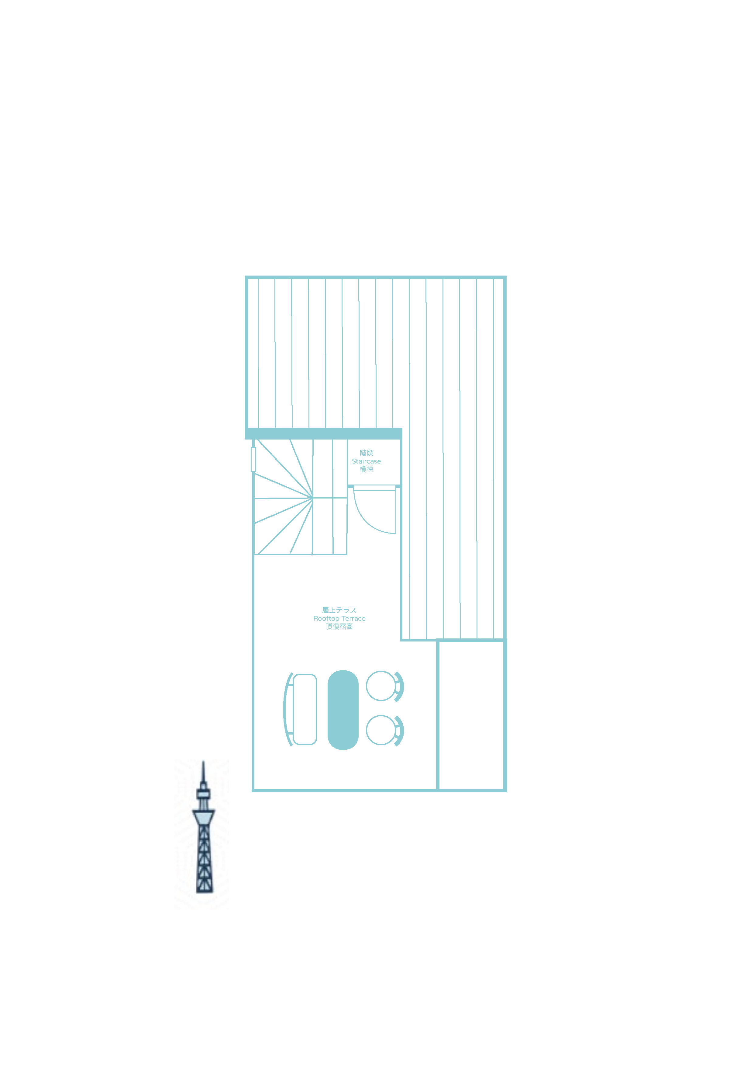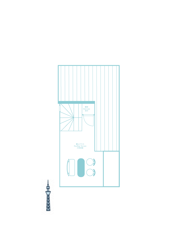 The highlight of the house is the open terrace on the top floor, offering a private sanctuary where you can relax and enjoy panoramic views of Tokyo. Here, you can marvel at the iconic Skytree and savour the unique perspective of your secret urban oasis.