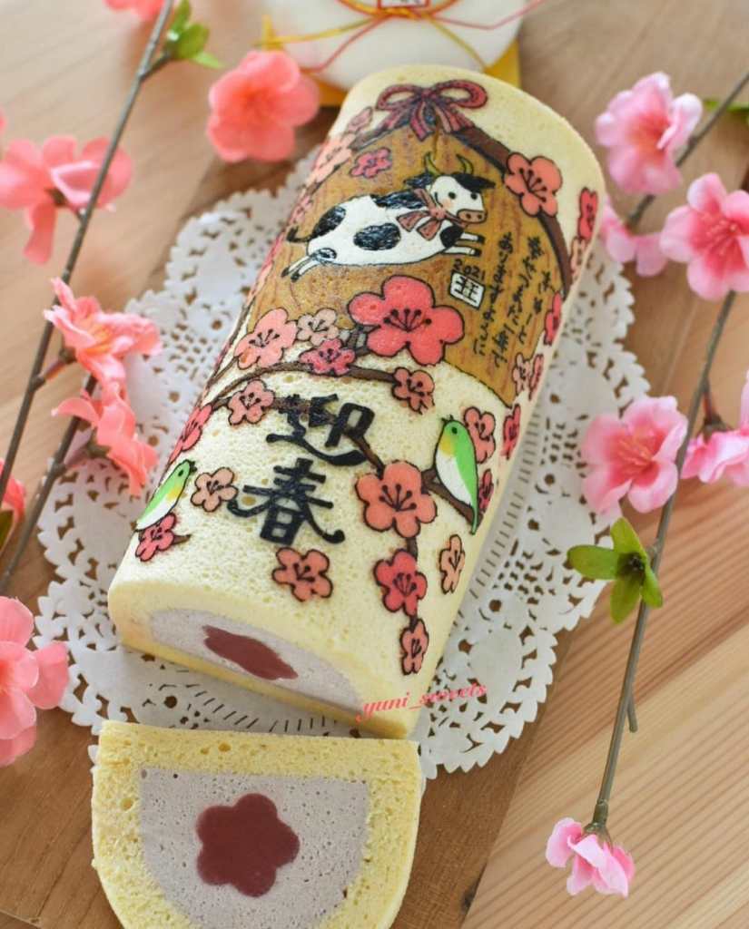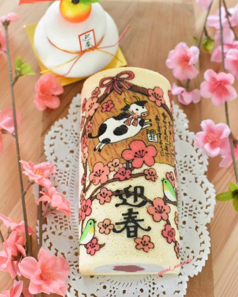 應景今天的氣氛,跟大家分享一下,網路上一位網友製作的「牛年正月梅花蛋糕捲」,直接把年賀卡設計在蛋糕捲上,非常有創意,色彩繽紛,添加上今年的主角「牛」和春季季節性的梅花圖騰,喜氣俏皮。