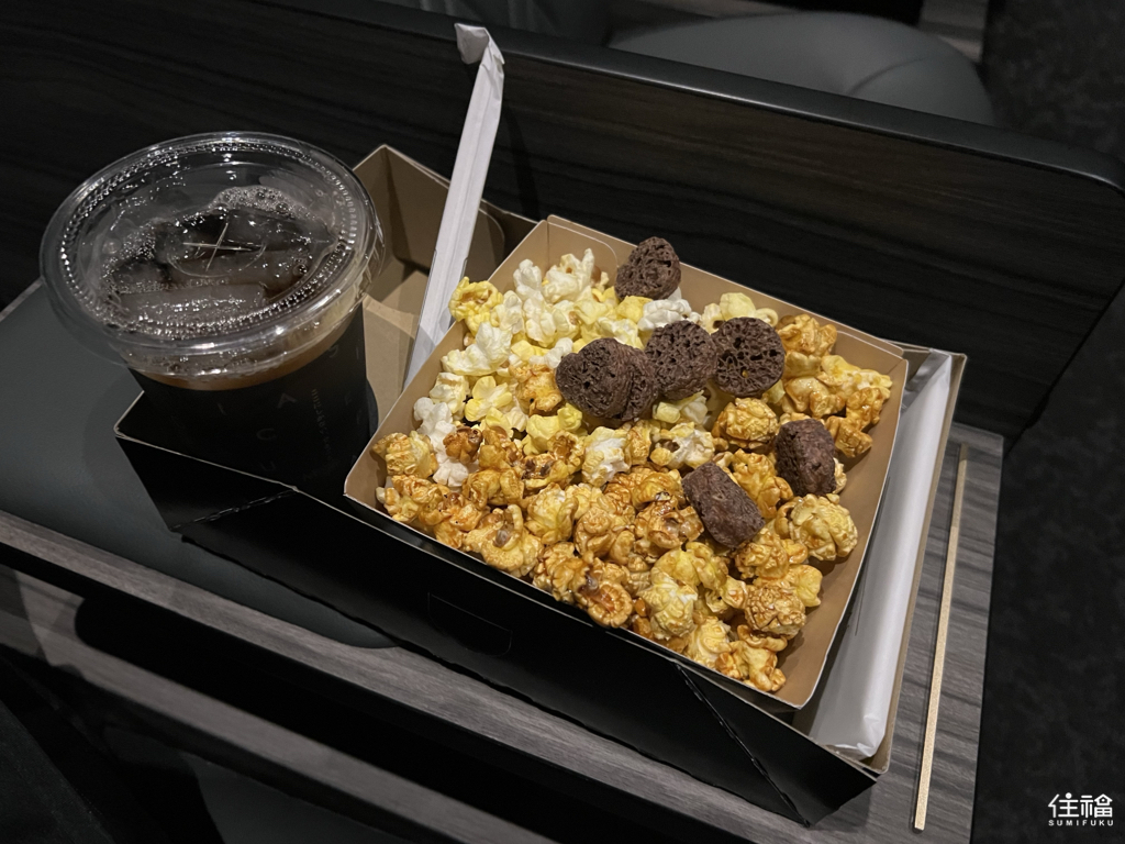 在正式開演前,觀眾可以於專屬休息室中悠閒地享用飲品與特製爆米花。