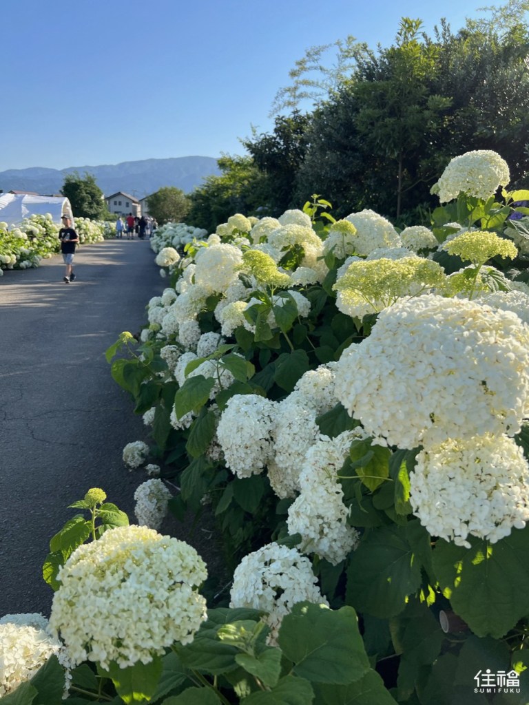 在相當於3.6個東京巨蛋大的稻田區周邊,種植了5000多株的繡球花,粉色、紫色、藍色、白色的多彩花卉,環繞著綠油油的稻田,美不勝收的風景,令人流連。