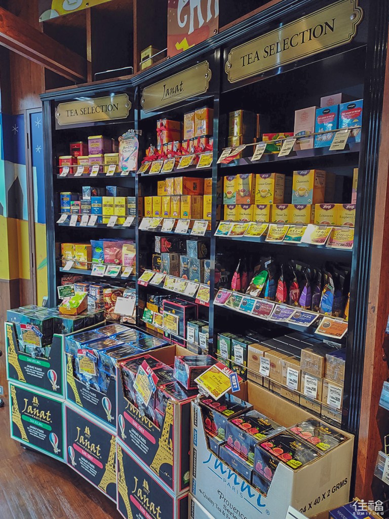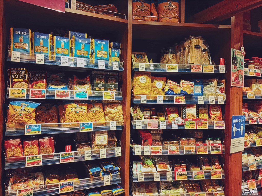當然,進口食品也少不了各種形狀、類型的義大利麵,還有用來搭配不同口味的義大利麵醬。另一邊的各式進口茶葉也是琳瑯滿目。