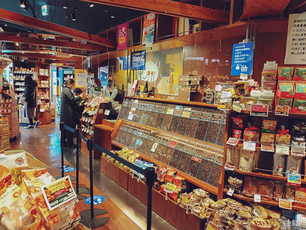 其實「KALDI」商店全名是「KALDI COFFEE FARM」,從名字就知道「KALDI」店內絕對少不了咖啡,每一家店的結帳櫃檯旁邊都是咖啡豆展示格,不只標示出咖啡豆名稱,酸味苦味比例與價格都說明得一清二楚,只要選好豆子跟店員表明希望購買的重量,磨粉服務也少不了。