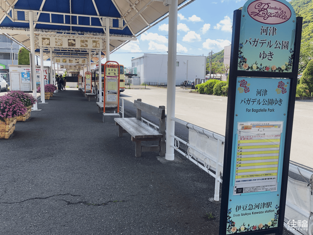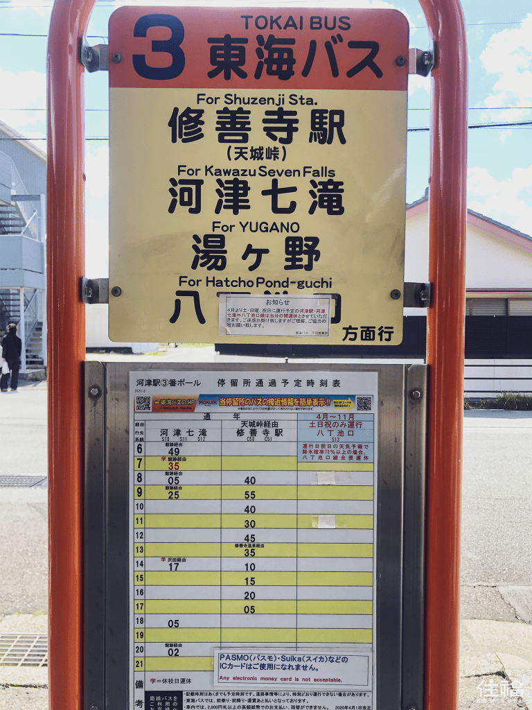 往河津七瀑布的東海巴士在河津站出來後左手邊,徒步約2-3分鐘,這個巴士站有屋簷和休息木椅,很明顯很好辨別。往河津七瀑布的站牌是離車站最遠的3號站牌,我們因為是使用南伊豆兩日通票(南伊豆フリー乗車券 ),所以直接可以搭乘,不用額外購買公車票。但是如果沒有事先買票的話,也可以在巴士站旁邊的售票處(乗車券発売所)購買河津七瀑布的一日券會比較划算,當然你也可以選擇直接搭巴士,是沒有問題的!