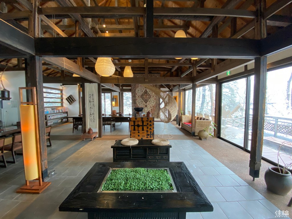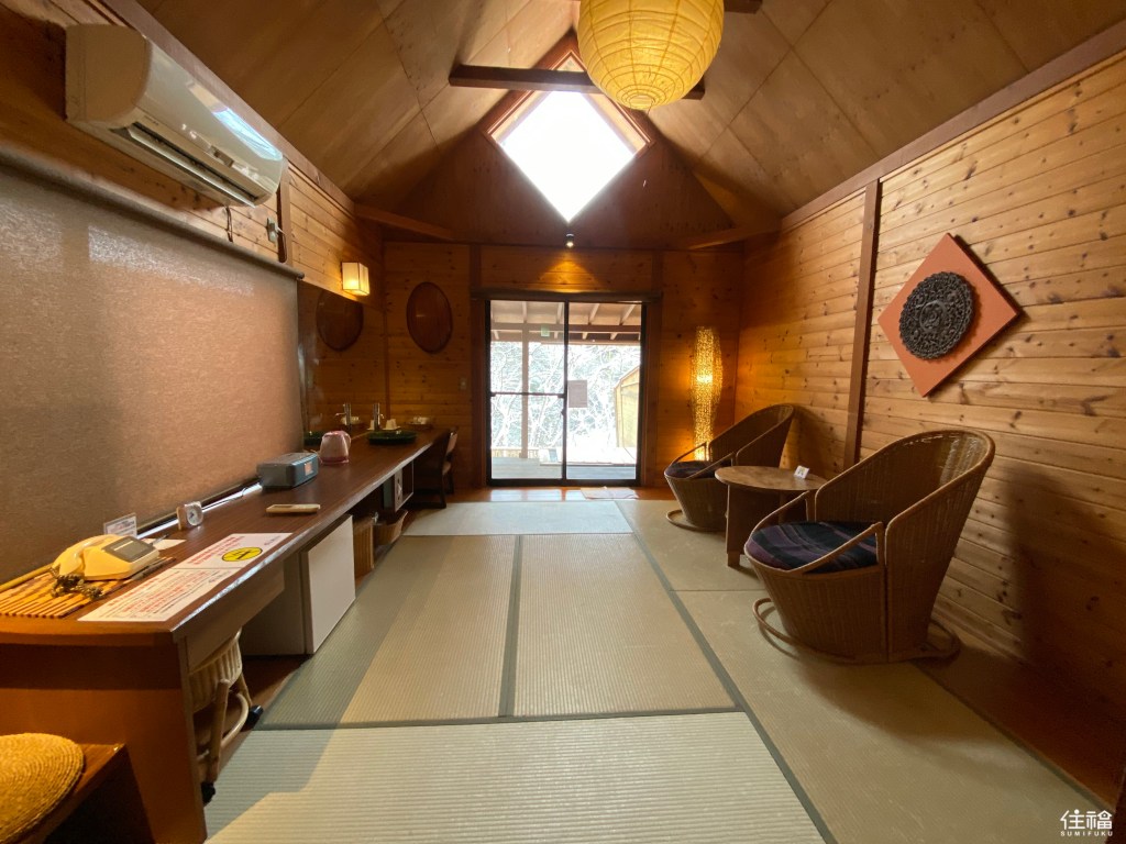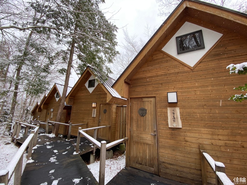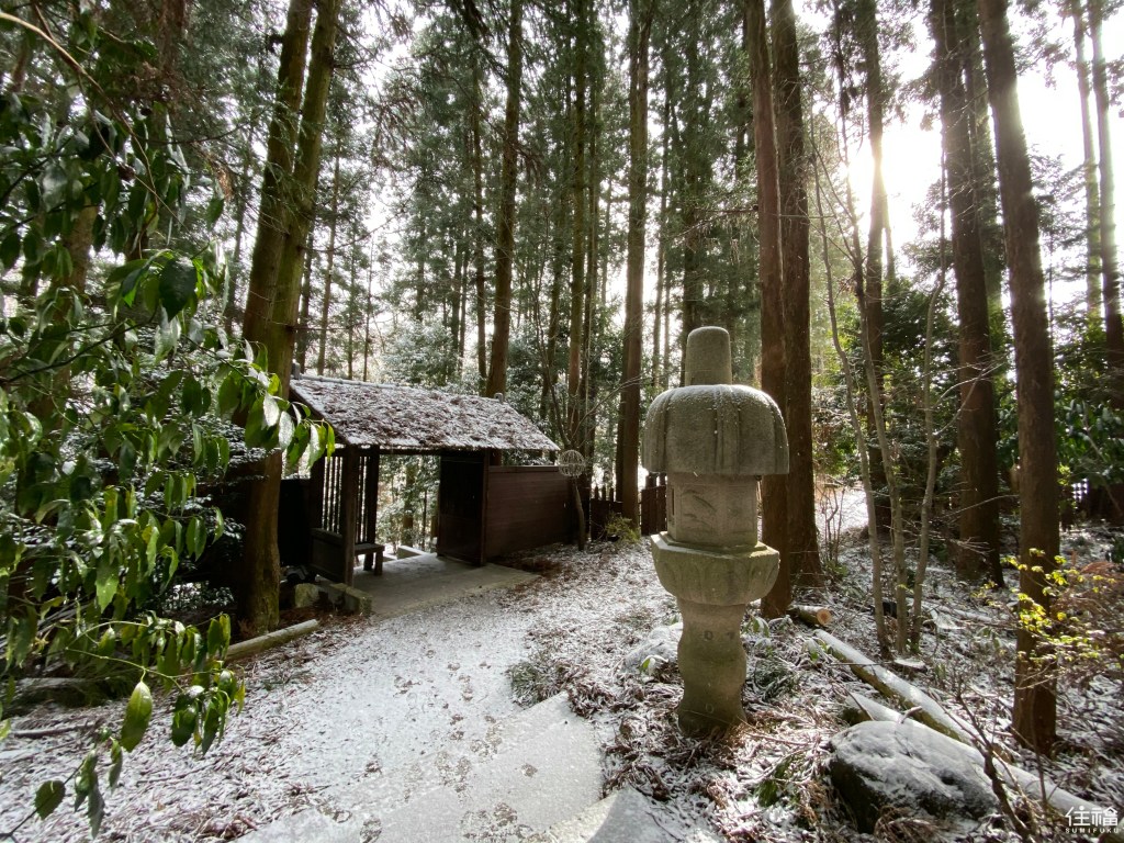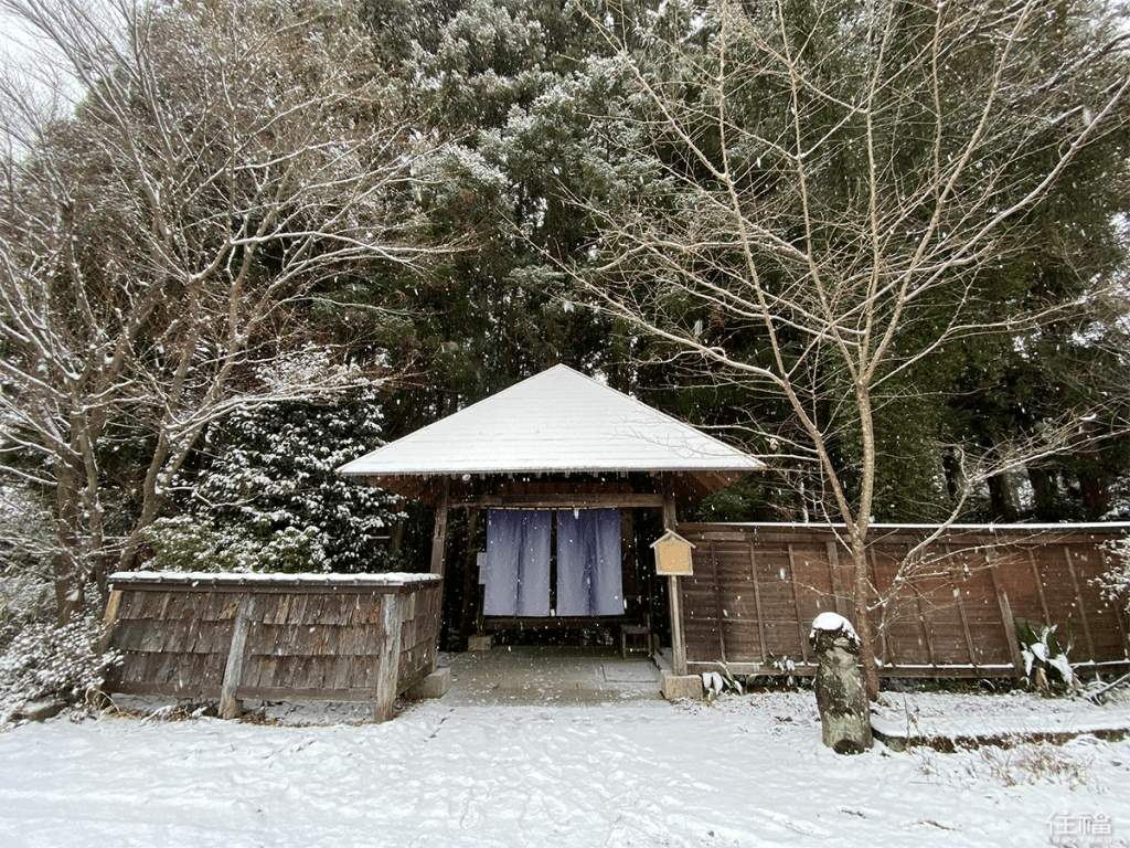 前往當天很幸運的遇到下雪的天氣,從大門外觀開始就被激起泡好泡滿的心情。從入口到接待處,途中的林間小徑格外有味道,令人彷彿置身於深山之中,而接待處的外觀及內觀皆可以感受到濃濃古民家的氛圍,跟櫃檯人員確認完今日預計使用人數及時間後,則將會由另一位服務人員帶至湯屋。全館共有10個獨立的露天溫泉湯屋,獨自一人外也適合情侶、小家庭一起使用。而湯屋有檜木湯池及石板湯池可以選擇,由於冬天的緣故,選擇比較暖和的檜木湯屋。