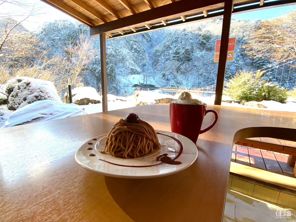 吃完午餐後,當然就是要來個下午茶才堪稱完美行程,就在距離鬼怒川溫泉車站步行約莫15分鐘,在太陽城王子大飯店(サンシャインシティプリンスホテル)的一樓裡,有間足湯咖啡廳,店內的餐點非常多樣,各式可口蛋糕、飲品跟聖代,每款看起來都非常可口,而這次則是直接選擇蒙布郎甜點套餐,搭配一杯飲品也只要1,100日圓,當然有免費的足湯可以泡之外,店家也非常貼心的有提供小毛巾可供擦拭,實在非常划算!而泡足湯的座位區則是在戶外的露檯,面對的正是鬼怒川及知名的鬼怒川楯岩大吊橋。這裡的美食美景享受程度也完全不輸剛剛的湯屋,只能說一天內能體驗到這樣的絕景及美食,真的幸福至極了。