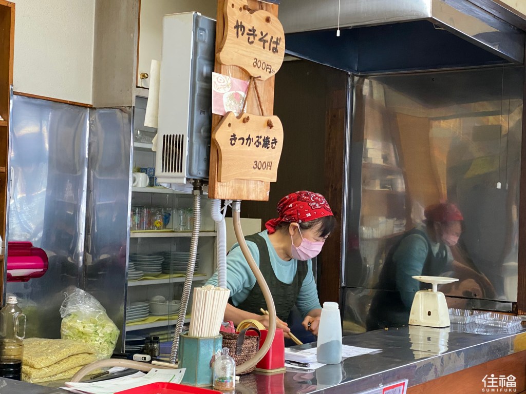 接著從湯屋最近的「小佐越車站」坐車到「鬼怒川溫泉車站」,從鬼怒川車站步行約4分鐘,有著一間位在住宅區裡的人氣日式炒麵店家,當天正逢新冠肺炎的高峰期,所以店家只提供外帶,但在車站附近有許多寬廣的座位區,所以不用擔心外帶沒地方用餐。而這間店的餐點就僅此一種,而依據份量價格有所不同,可以選擇200日圓~700日圓,以100圓差額為單位,老闆娘也非常熱情,還開玩笑的說想點800圓的份量也是沒問題。恭敬不如從命,且還得知我是從外地來的,還免費送了一顆荷包蛋。看到炒好的800圓份量,剛剛前一位客人的400圓份量根本小巫建大巫,在要離開前老闆娘還貼心的提醒說,吃不完的話冷掉一樣好吃記得帶回家繼續品嚐喔!