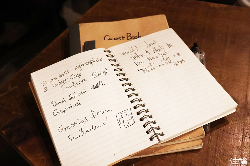 一樓多為吧台座位,即使獨自一人來喝咖啡也不顯突兀,可以與店主交流,或是靜靜享受咖啡、甜點與關東煮。店內陳設筆記本,來訪者想留下文字與塗鴉,也可以盡情使用,翻閱本子,你也能欣賞到來自世界各地的筆跡,非常可愛又貼心。