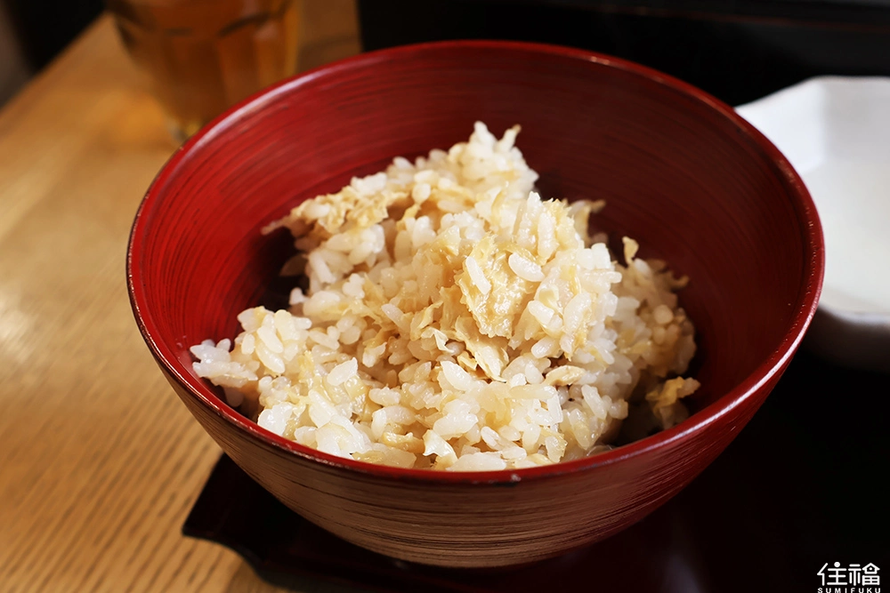 炊飯的湯葉跟鍋裡的湯葉不太一樣,反而吃起來更有彈性,而厚度也比較多一些,對於喜歡吃炊飯的人,想信這個湯葉炊飯也是新鮮的嘗試之一!整體吃起來或許不像吃到飽火鍋,反倒是多了一層精緻感,會讓你覺得這是在體驗「百年歷史」的湯葉食材,非常有情境,尤其是店內還在室外設置了枯山水的風景,真的頗有道地之感,很值得跟朋友約在這裡吃飯,感受一下湯葉鍋。