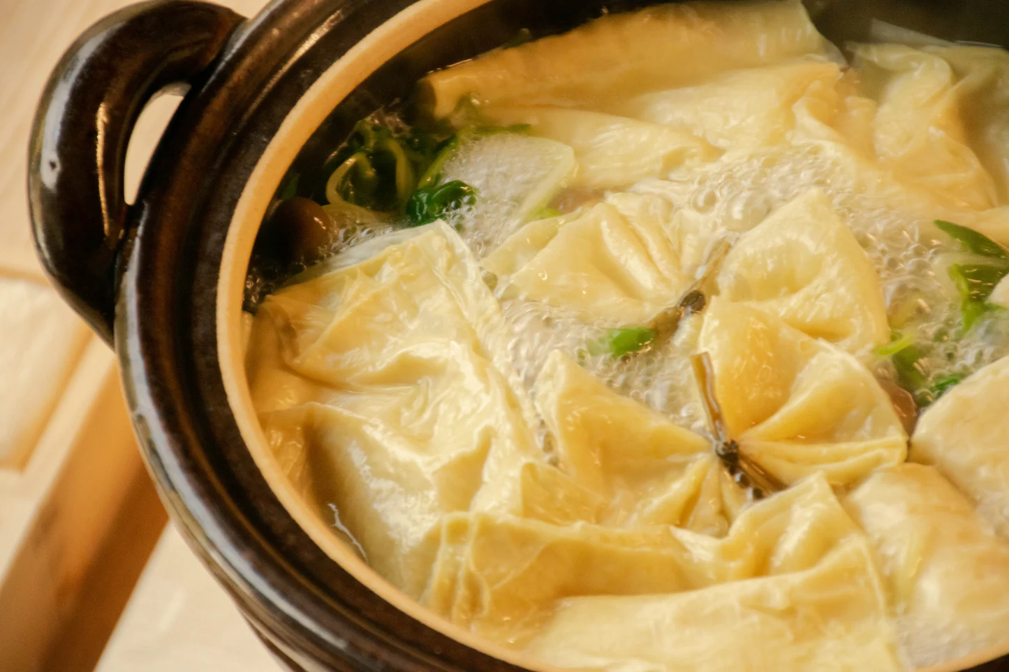 這是我第一次吃到湯葉鍋,原本想像得猶如台灣豆皮,咬起來很有口感,直至鍋子端上來,服務人員開始幫你加熱,然後上層湯葉會變得像是球一樣鼓起來,非常有趣,由於京湯葉本身很薄,所以鼓起來的時候特別可愛有感,而湯葉很薄,下鍋煮一下,馬上就能開動!