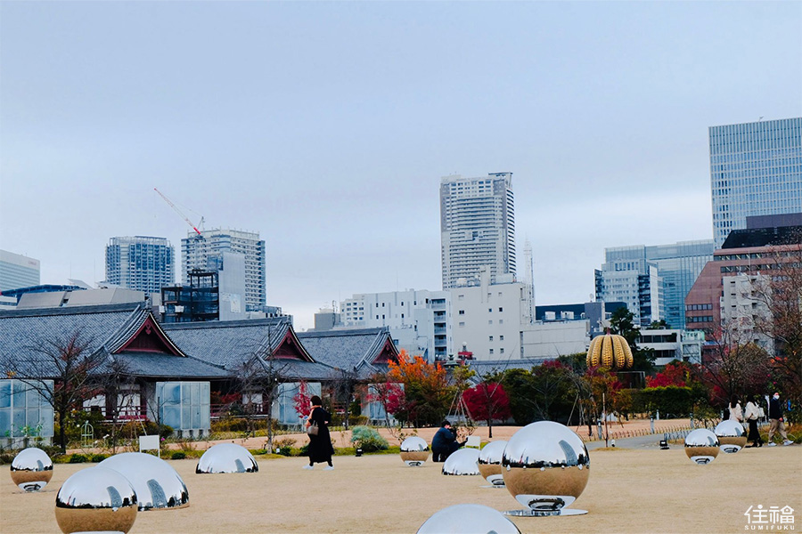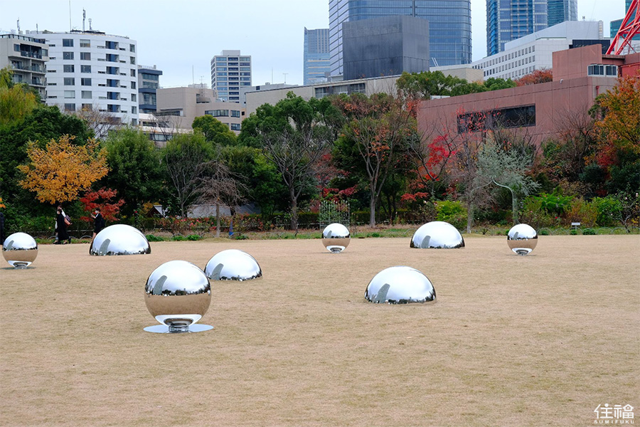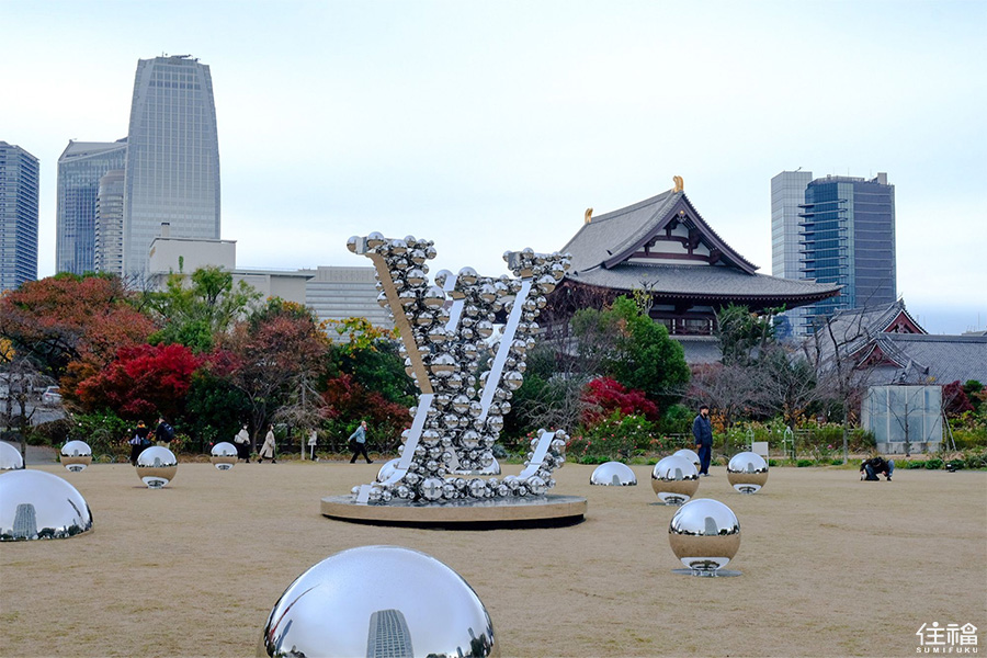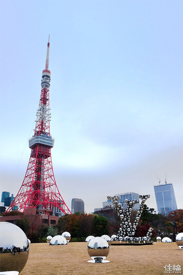 在東京鐵塔旁邊的芝公園可以看到帶有金屬球體的LV標誌與東京鐵塔,金屬的球體反射周邊的景色,一個鏡頭就可以收藏到東京鐵塔、LV裝飾和草間彌生南瓜點點!