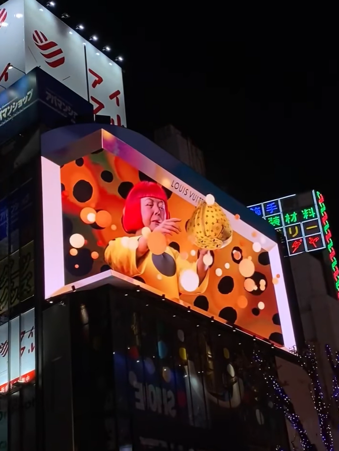 透過動畫將草間彌生的人像高度擬真現身新宿街頭,展現跨界合作的主題,畫面中的南瓜像是快要掉下來一樣,非常逼真!為熱鬧的新宿街口增添了藝術的氣息。