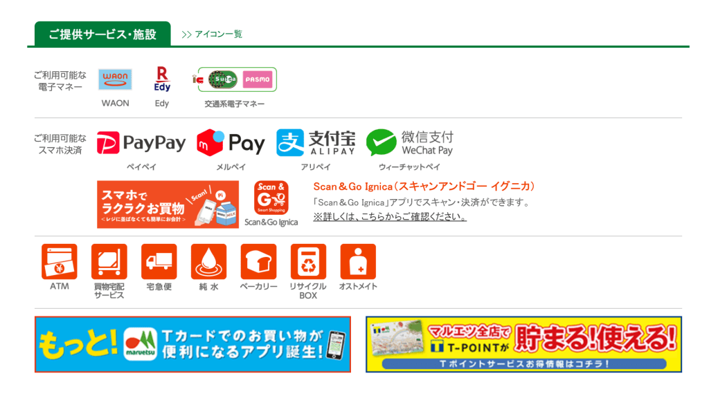 Most locations take cash and select credit cards (as with most stores in Japan, Visa cards are the most likely to be accepted, though Maruetsu tends to also accept MasterCard and JCB cards), as well as Waon’s electronic cash cards, in case you happen to own one of those.