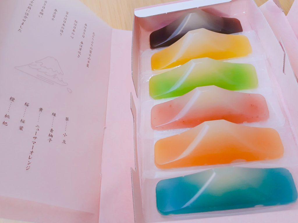 這次買的「富士山型羊羹」是在「ところてんの伊豆河童」所購買的甜食禮盒,包裝實在非常可愛,大大的富士山,櫻花飄落在湖裡,夕陽慢慢的露出美麗的雲彩,打開盒子裡面寫著「櫻花是日本的心」、「富士山是日本的驕傲」,用富士山型羊羹結合日本代表櫻花和富士山作起了詩,更厲害的是這5種不同顏色的羊羹都是不同口味的哦,平常吃不到的口味難道大家不好奇吃起來是什麼味道嗎?