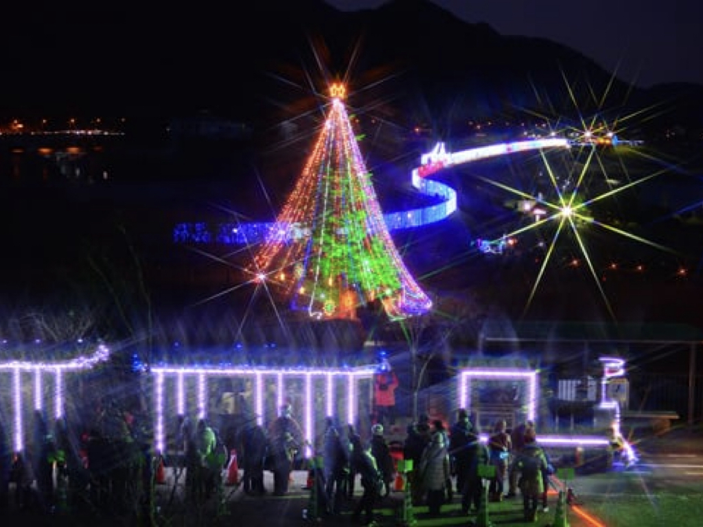 這棵掛滿數萬顆燈泡的巨型聖誕樹,規模位居日本第一,在冬夜星空與湖水倒映下熠熠生輝。