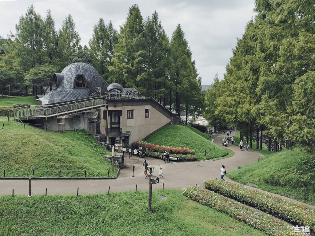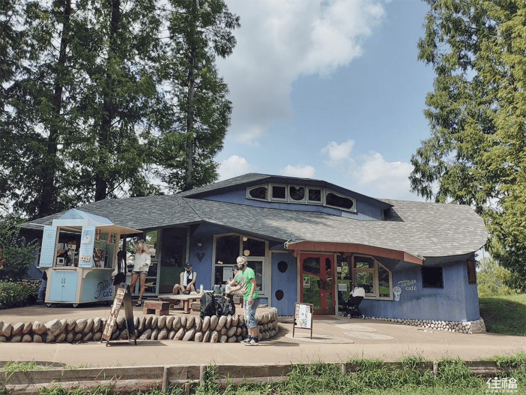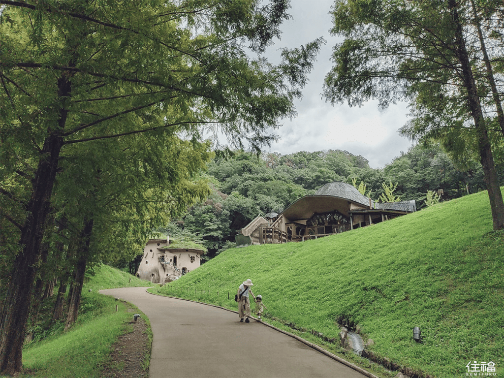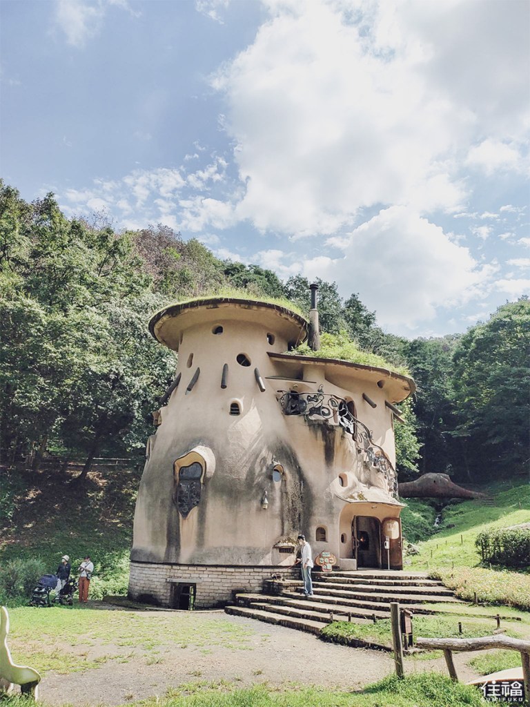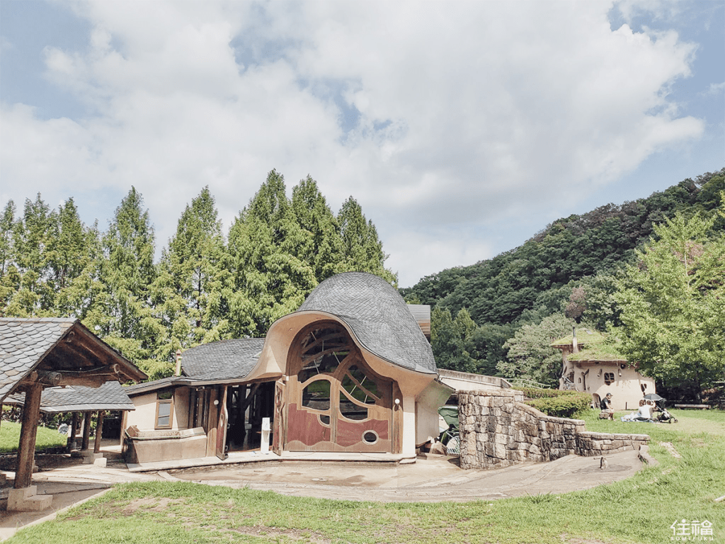 沿著入口小徑進入,遠遠就可以看到蘑菇造型、屋頂長著綠草的房屋,彷彿進入了童話世界般。