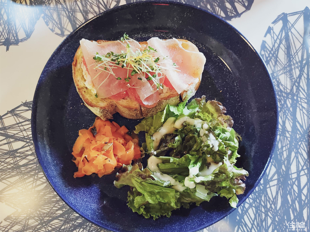公園裡也少不了嚕嚕米主題咖啡屋,藍色小屋也好可愛,有輕食飲料也有漢堡排套餐,這天小編跟夥伴點了漢堡排套餐跟煙燻鮭魚輕食套餐,搭配生菜與胡蘿蔔絲,營養又健康啊!