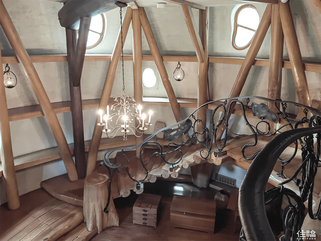 蘑菇小屋裡面空間蠻寬敞,內裝都是原木打造,有桌椅、廚房、壁爐等設施,沿著旋轉樓梯往上還可以俯瞰公園景色,二樓的門可以打開通屋外的樓梯,可以看到許多大大小小的孩子們像進了秘密基地一樣四處探險,圓柱狀的壁爐還可以爬到上一層,十分具有童趣。