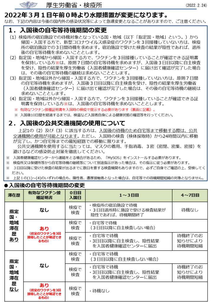 - 入境後24小時內可搭乘大眾交通工具,依據個人是否符合三劑疫苗或其他指定條件完成指定隔離天數。