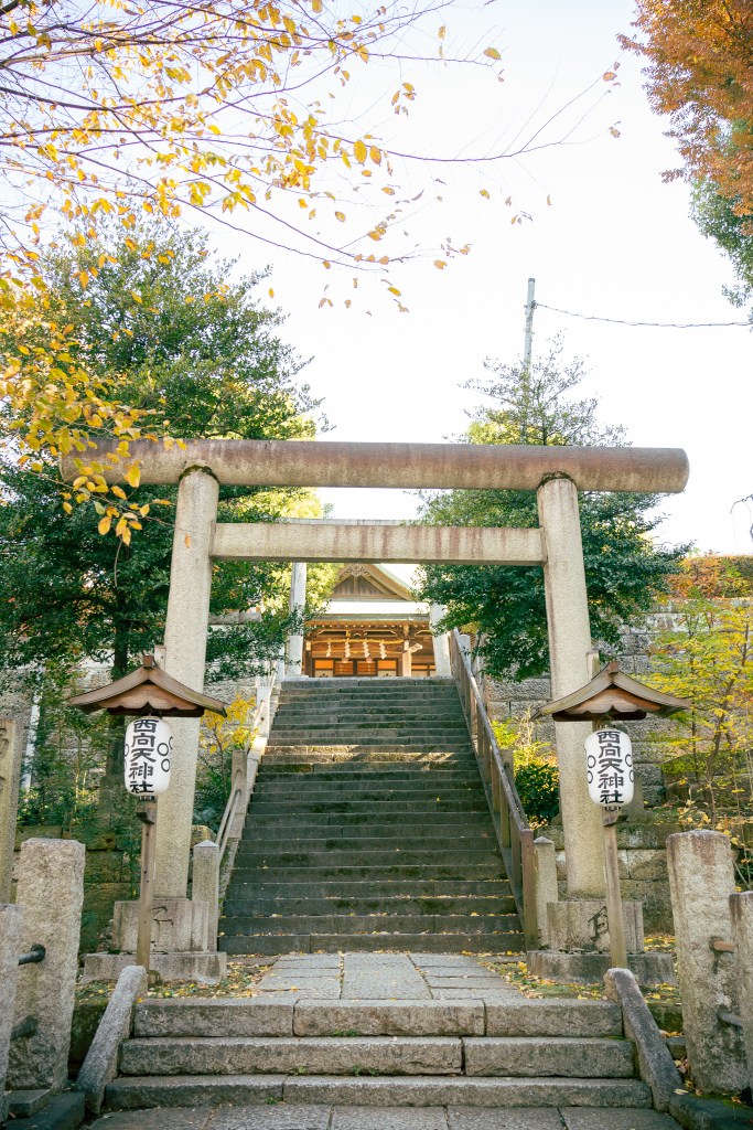 住宅街の中に現れる石段をのぼると「西向天神社」。西向天神社という名前は、社殿が西方を向いていることからつけられた名前。