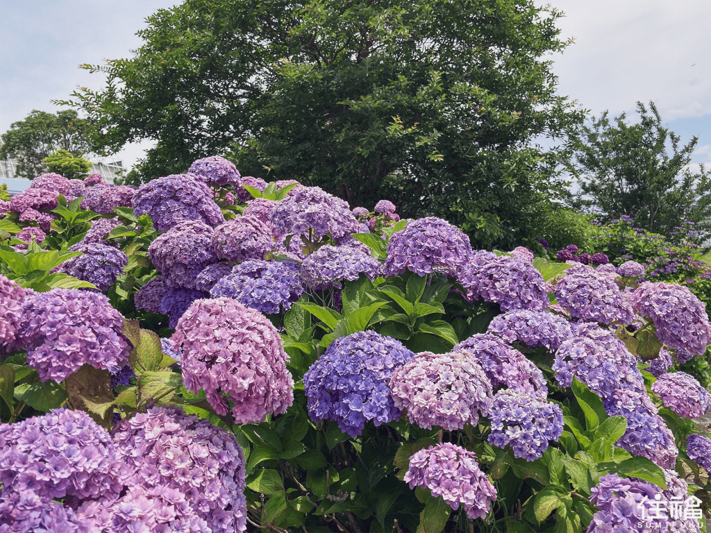 在青海站下車,不到五分鐘的距離,就可以看到一球一球的繡球花,非常的夢幻。在白紫相間的繡球花世界裡,以palette town摩天輪為背景,化身為花之精靈,拍下一張張美妙的相片吧!