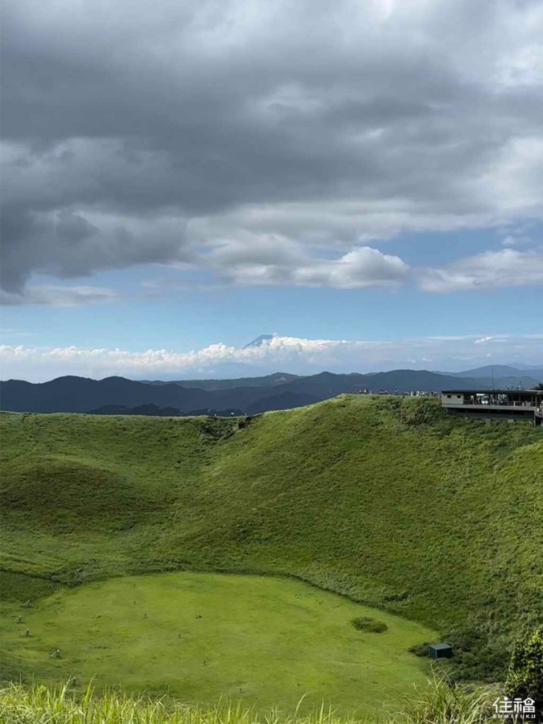 漫步在大室山頂,一面是山一面是海,抹茶山的綠意和太平洋的遼闊盡收眼底,天氣好甚至能遠眺位在山梨縣的富士山。