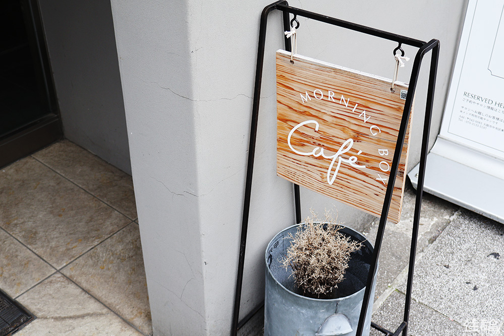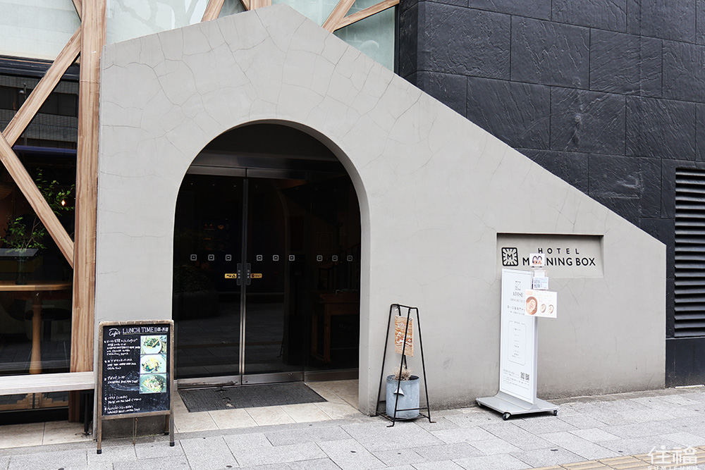 以水泥石牆打造而成的三角外觀設計,正是 Hotel Morning Box Osaka 的大門,門口設計少許的室外座位區,置放一塊木頭色看板,以及三角立牌,標示著店內飲品與菜單,本以為是飯店,卻沒想到這是間與咖啡廳複合打造而成的 Café MORNING BOX ,猶如心齋敲鬧區裡頭的幽靜小綠洲。