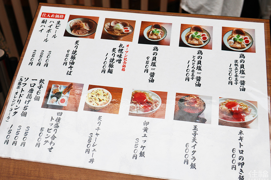店家很貼心的是,店內酒精飲料都十分便宜,希望可以透過價錢回饋讓學生還有上班族,啤酒、軟性飲料等等,大致價格落在 150~300 日幣左右,是可以勇敢點起來的甜甜價,關於菜單,我絕對要熱推「鶏の貝塩とろとろ赤玉子つき」!貝塩系列的湯頭真的都太好喝~清爽回甘也不過鹹,是難得我可以喝下肚的拉麵湯頭,Q彈的麵條,再配上入口即化的溫泉紅蛋,真的是會讓人忍不住一再回訪。