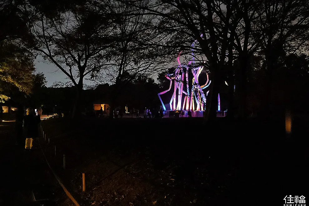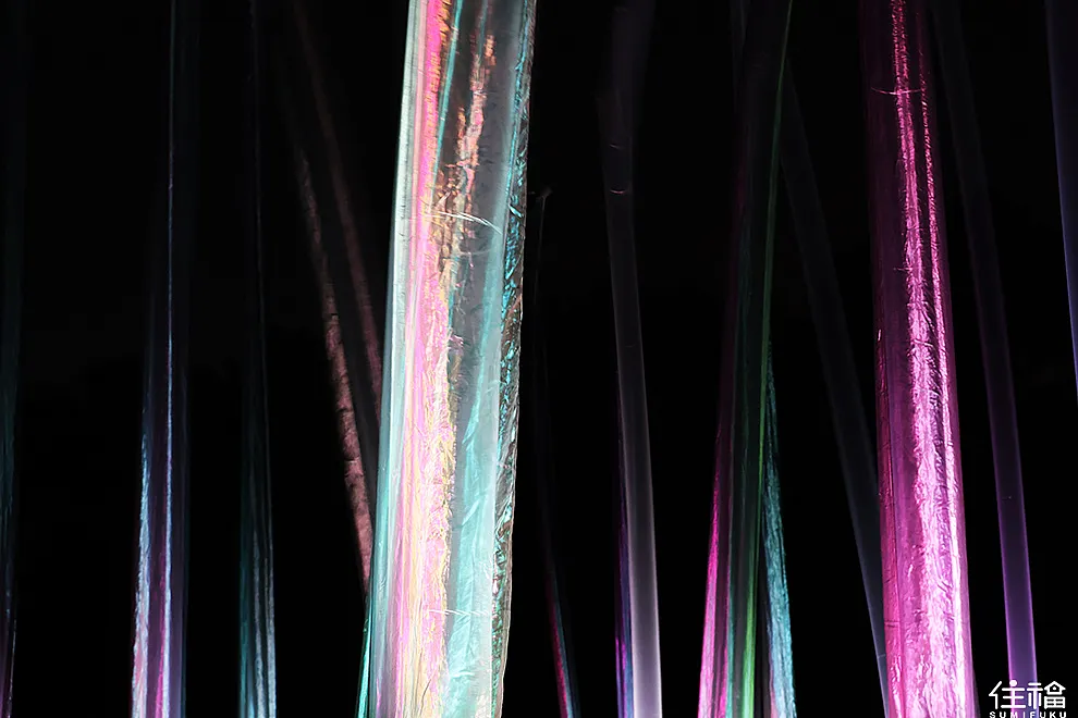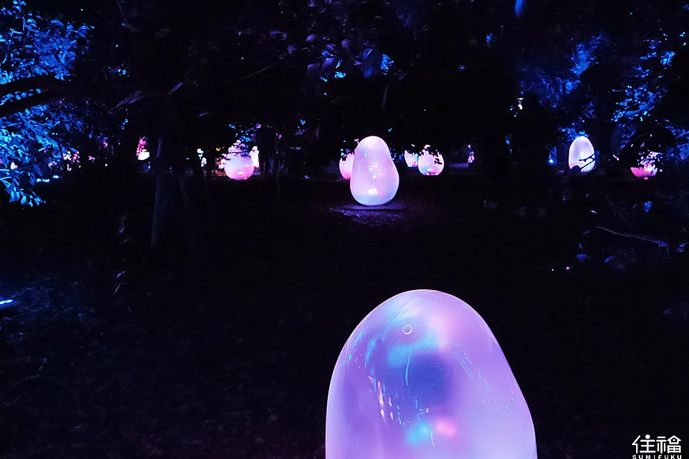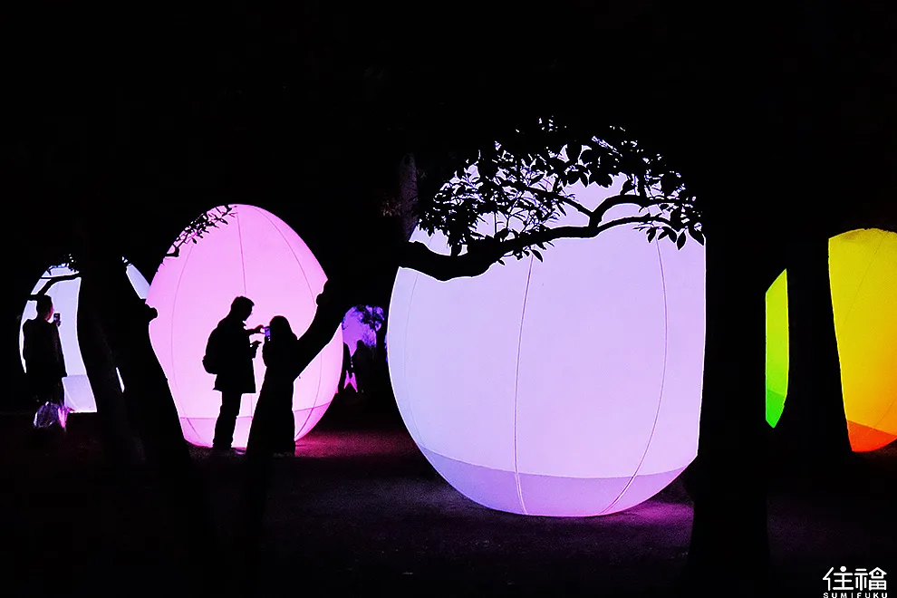 我去過台灣跟日本的部分展區,但目前我最喜歡的就是大阪長居植物園,植物園在夜晚的時候,並不那麼靜謐,感覺植物裡頭的生物都還在呼吸著。而許多互動裝置,你感覺像是活著,必須仰賴植物園內的風、聲音,更甚至是自然之間的感應,才有辦法顯示,而從入園探險的那刻,你感覺好像跟自然是融為一體。